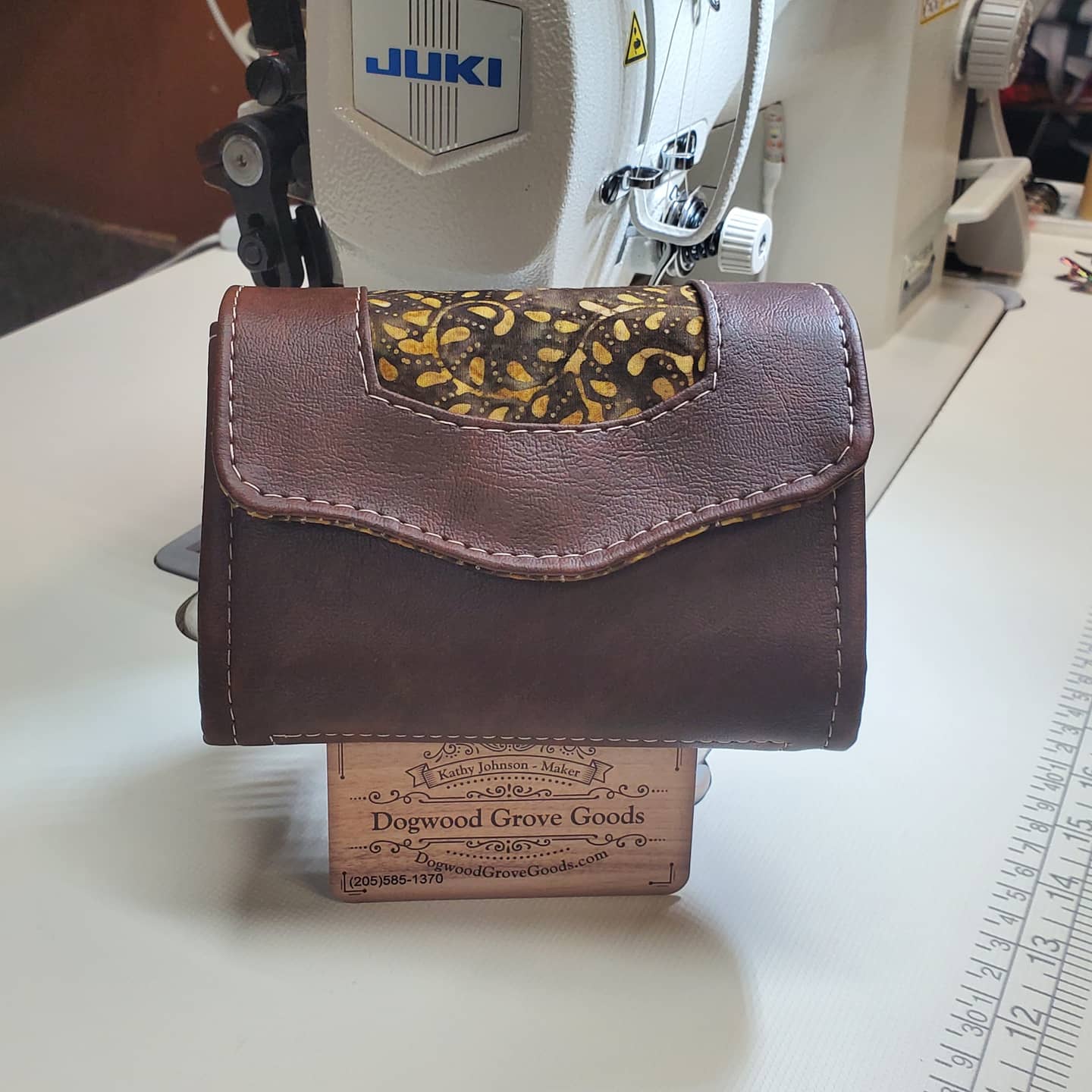 Mini version of the popular NCW. Interior features 6 card slots, 2 slip pockets, zippered pocket and main compartment that could hold chapstick. Measures approximately 5"x 3"x 1.5". The flap has a Batik print, and the exterior is a brown marbled vinyl.